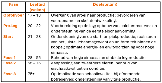 Vanaf fase 2 wordt het calciumgehalte verhoogd en het fosforniveau aangepast aan de veranderende behoefte van de hen.